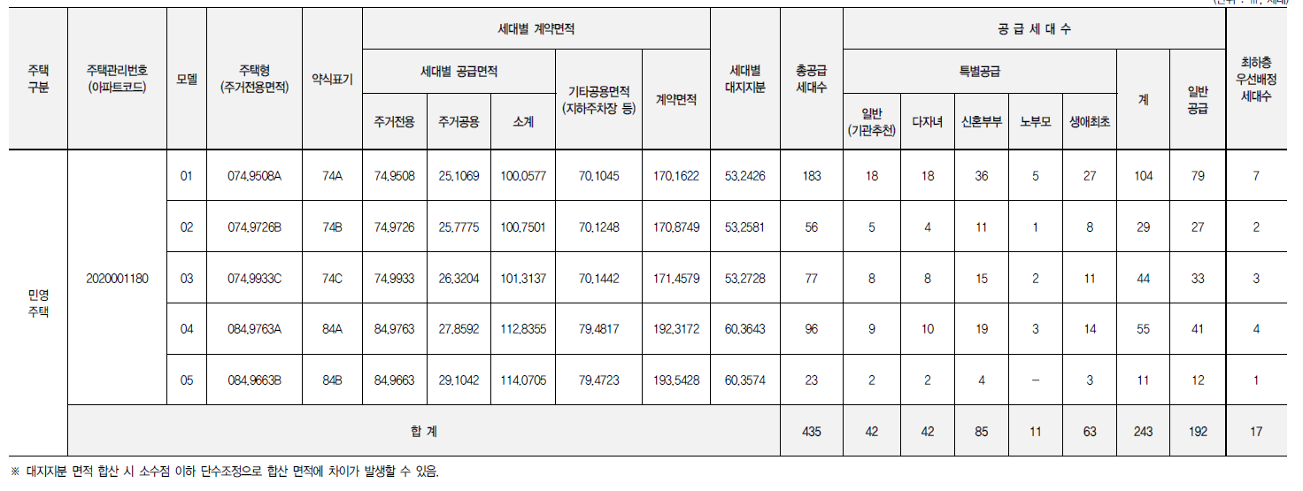 74A - 183세대, 74B - 56세대, 74C - 77세대, 84A - 96세대, 84B - 23T세대로