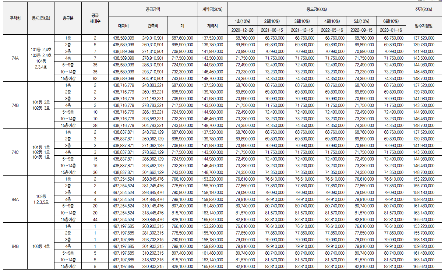 84타입이 가장 큰 평형이라 일반공급 중 추첨제로 선정하는 세대는 없다는게 아쉽네요!
