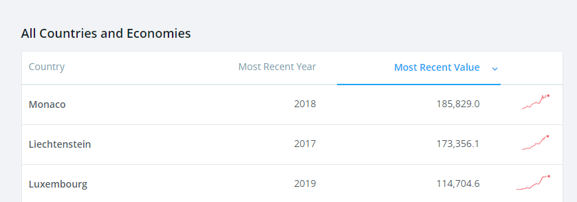 - 세계은행 홈페이지에서 조회해본 결과 모나코 1인당 GDP가 2018년 기준 무려 185,829USD 네요.